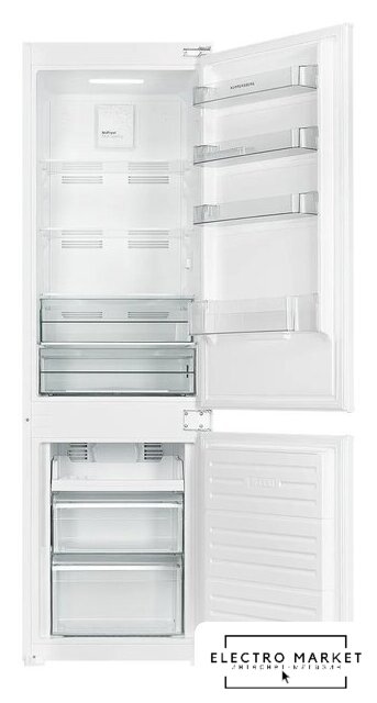 встраиваемый, полный No Frost, электронное управление, класс A+, полезный объём: 292 л (206 + 86 л), инверторный компрессор, перенавешиваемые двери, нулевой зазор, лоток для яиц, 55.4x56.5x177.5 см, белый