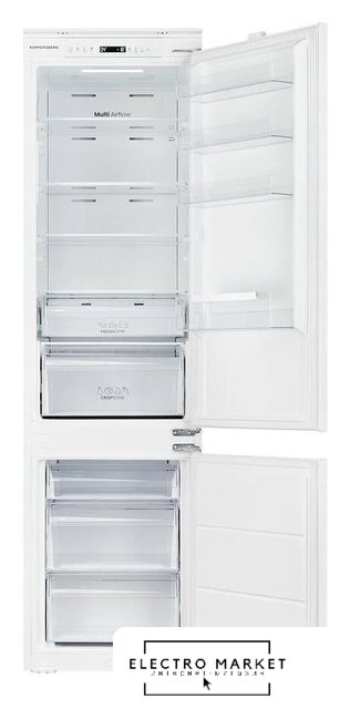 встраиваемый, скользящие направляющие, полный No Frost, электронное управление, класс B, полезный объём: 195 л (133 + 62 л), перенавешиваемые двери, лоток для яиц, 54x54.9x177.2 см, белый