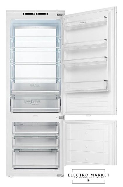 встраиваемый, полный No Frost, электронное управление, класс A++, полезный объём: 284 л (215 + 69 л), инверторный компрессор, зона свежести, перенавешиваемые двери, полка для вина, лоток для яиц, 54x54.5x193.5 см, белый