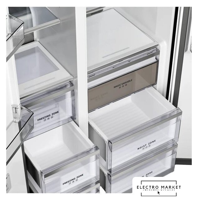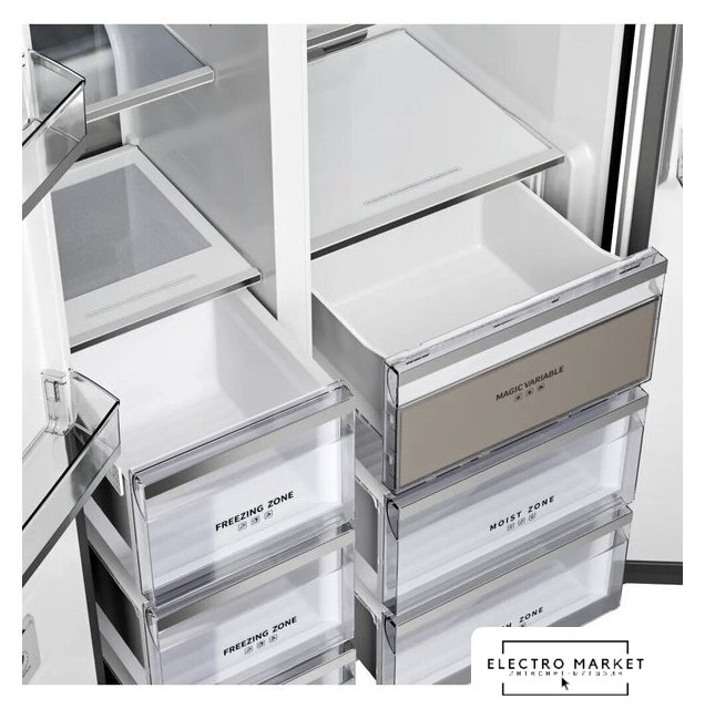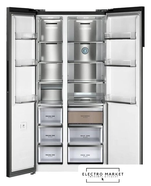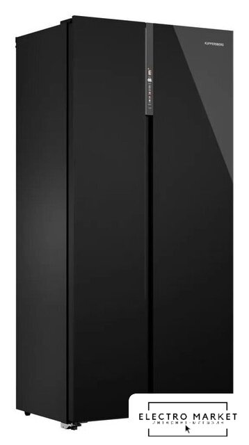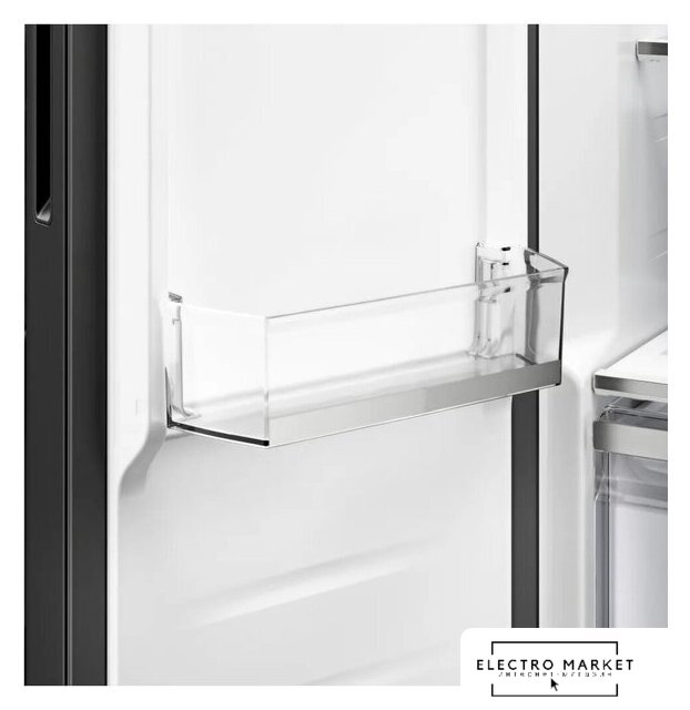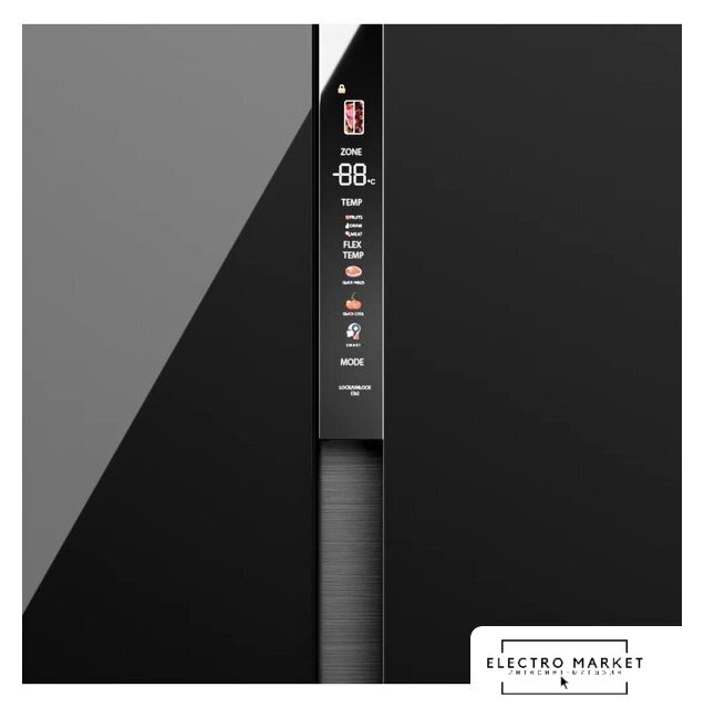 отдельностоящий, полный No Frost, электронное управление, класс A++, полезный объём: 578 л (430 + 148 л), инверторный компрессор, зона свежести, выдвижная полка, лоток для яиц, отделка: стекло, 80x73.5x185 см, черный