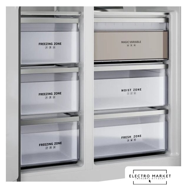 отдельностоящий, полный No Frost, электронное управление, класс A+, полезный объём: 510 л (366 + 132 л), инверторный компрессор, зона свежести, диспенсер, лоток для яиц, 85.5x72.7x183.5 см, бежевый