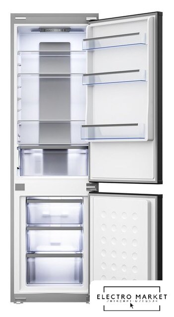 встраиваемый, полный No Frost, электронное управление, класс A, полезный объём: 284 л (215 + 69 л), инверторный компрессор, зона свежести, перенавешиваемые двери, полка для вина, лоток для яиц, 54x54.5x193.5 см, белый