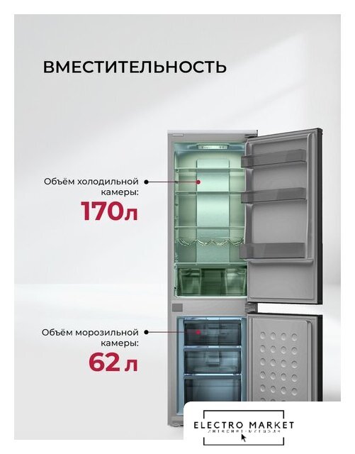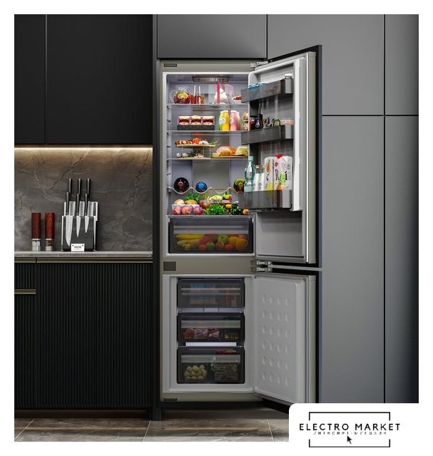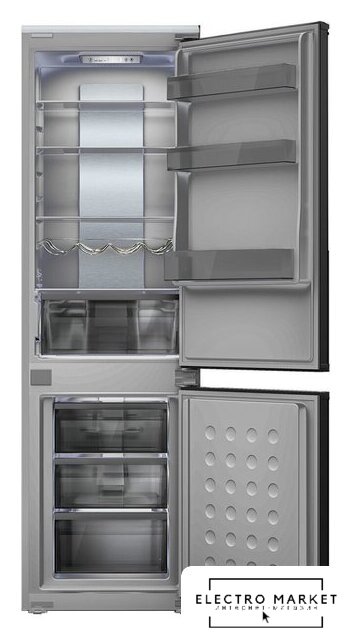 встраиваемый, жесткое, без No Frost, сенсорное управление, полезный объём: 264 л (183 + 81 л), перенавешиваемые двери, лоток для яиц, 55.9x54.6x177 см, белый