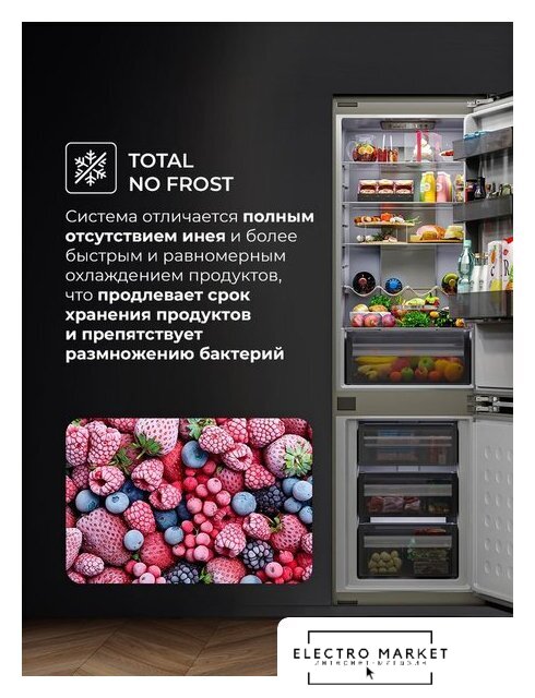 встраиваемый, жесткое, полный No Frost, электронное управление, класс A+, полезный объём: 262 л (198 + 64 л), зона свежести, перенавешиваемые двери, полка для вина, лоток для яиц, 54x55x193.7 см, белый