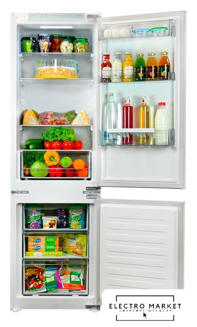 встраиваемый, полный No Frost, механическое управление, класс A+, полезный объём: 241 л (182 + 59 л), перенавешиваемые двери, лоток для яиц, 54x51x178.5 см, белый