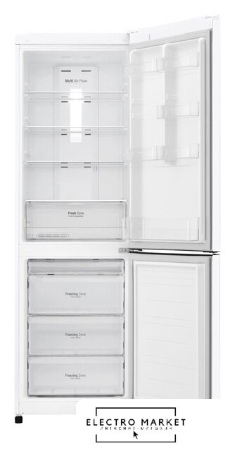 отдельностоящий, без No Frost, электронное управление, класс A+, полезный объём: 370 л (251 + 119 л), зона свежести, перенавешиваемые двери, полка для вина, лоток для яиц, 59.5x62.9x206.8 см, серебристый