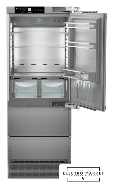 встраиваемый, жесткое, No Frost (морозильная камера), электронное управление, полезный объём: 523 л (363 + 160 л), зона свежести, перенавешиваемые двери, автодоводчик дверей, полка для вина, лоток для яиц, 91x61x202.7 см, серебристый