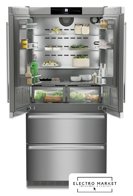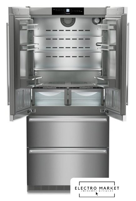 отдельностоящий, No Frost (морозильная камера), сенсорное управление, полезный объём: 663 л (386 + 277 л), инверторный компрессор, зона свежести, перенавешиваемые двери, диспенсер, складная полка, полка для вина, лоток для яиц, масленка, 120.4x71.9x185.5 см, нержавеющая сталь