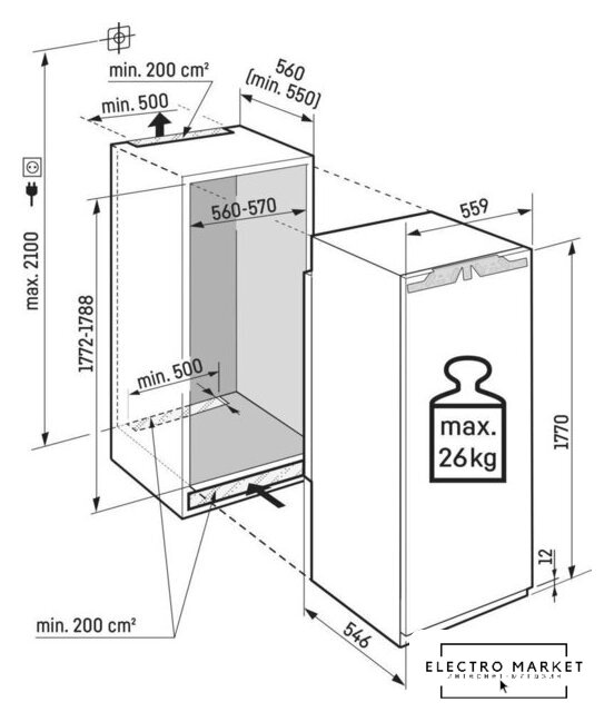 встраиваемый, скользящие направляющие, полный No Frost, электронное управление, класс B, полезный объём: 195 л (133 + 62 л), перенавешиваемые двери, лоток для яиц, 54x54.9x177.2 см, белый