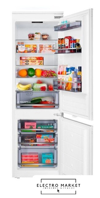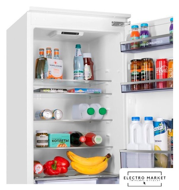 встраиваемый, скользящие направляющие, полный No Frost, сенсорное управление, класс A+, полезный объём: 275 л (207 + 68 л), инверторный компрессор, зона свежести, перенавешиваемые двери, лоток для яиц, 54x54.5x193.2 см, белый