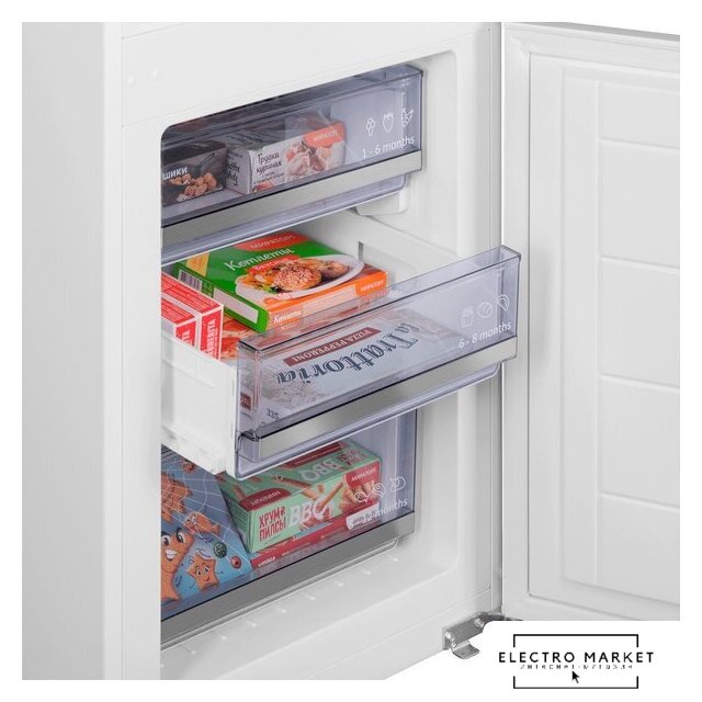 встраиваемый, скользящие направляющие, без No Frost, электронное управление, класс A+, полезный объём: 243 л (176 + 67 л), инверторный компрессор, перенавешиваемые двери, лоток для яиц, 54x54x175.5 см, белый