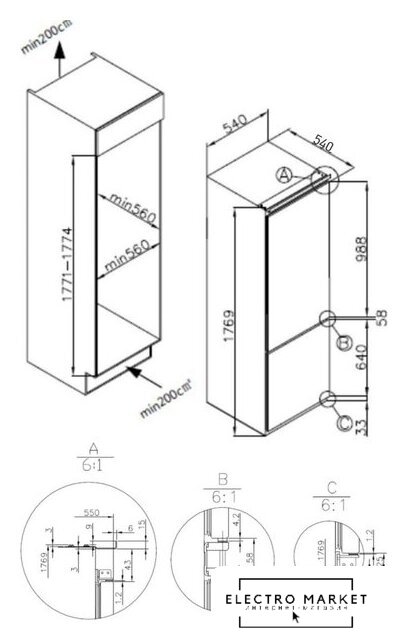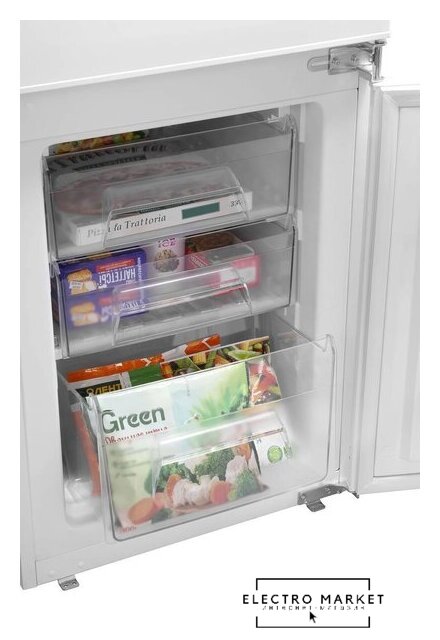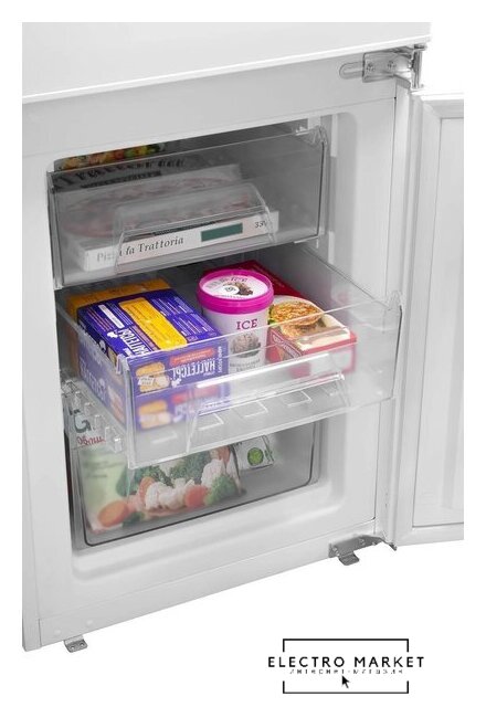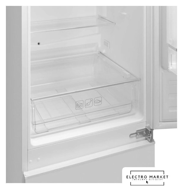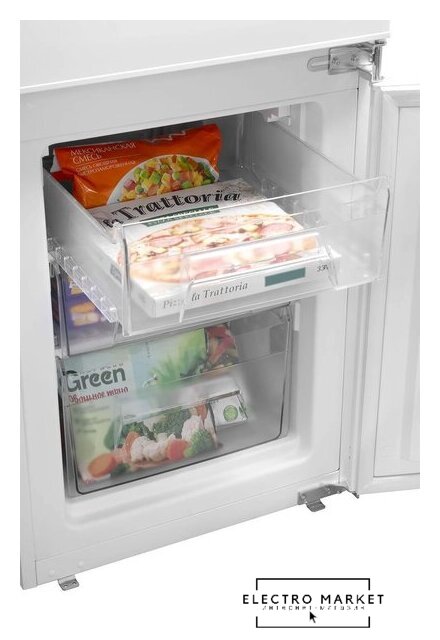 встраиваемый, скользящие направляющие, без No Frost, электронное управление, класс A, полезный объём: 186 л (171 + 15 л), перенавешиваемые двери, лоток для яиц, 54x55x121 см, белый