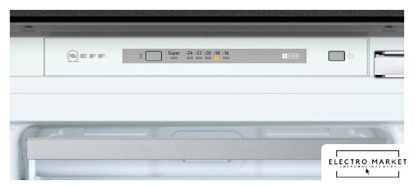 встраиваемый, плоские шарниры, полный No Frost, электронное управление, класс A+, полезный объём: 255 л (188 + 67 л), перенавешиваемые двери, лоток для яиц, 54.1x54.5x177.2 см, белый