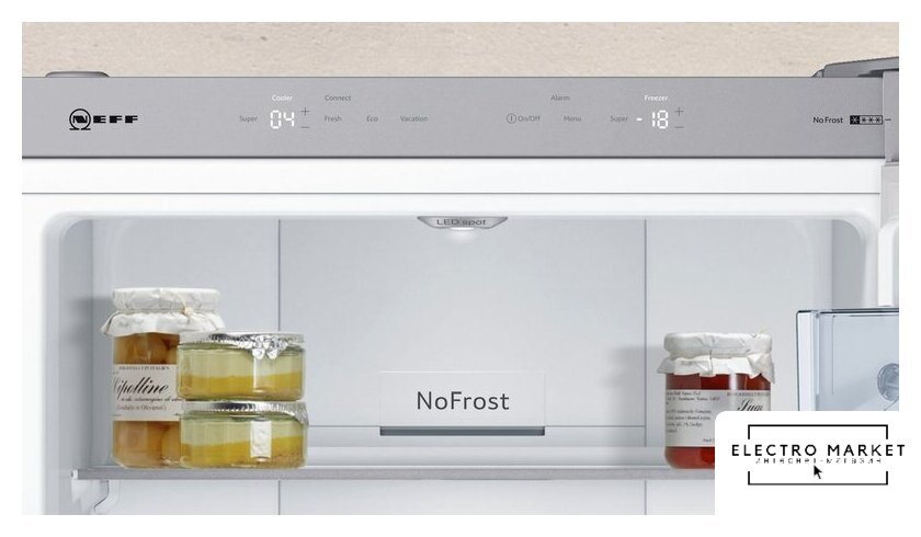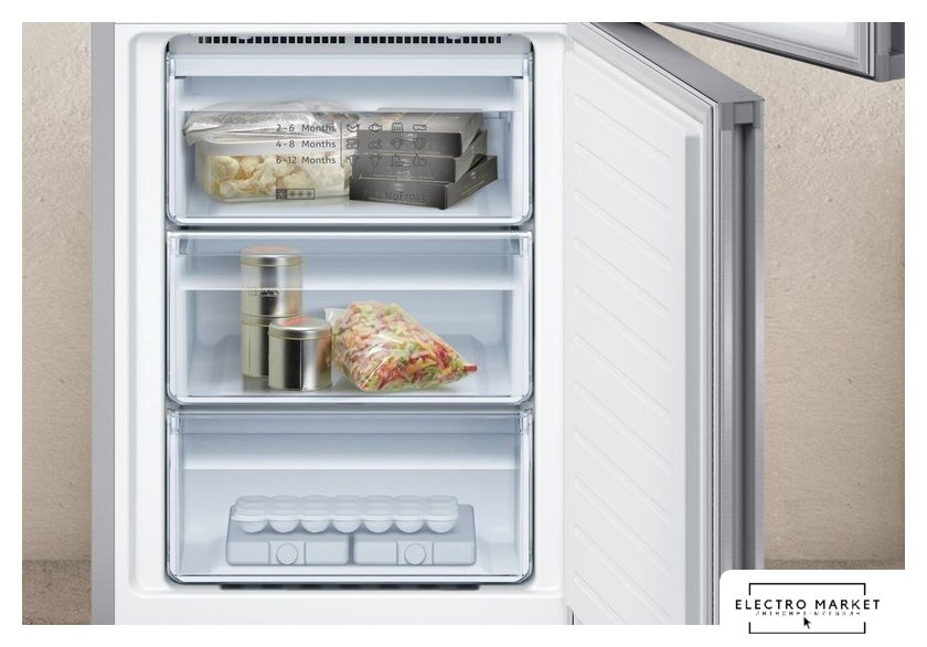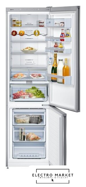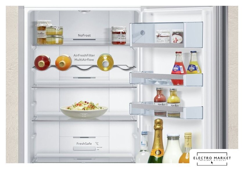отдельностоящий, полный No Frost, электронное управление, класс A++, полезный объём: 366 л (279 + 87 л), зона свежести, перенавешиваемые двери, полка для вина, лоток для яиц, отделка: защита от отпечатков, 60x66x203 см, нержавеющая сталь