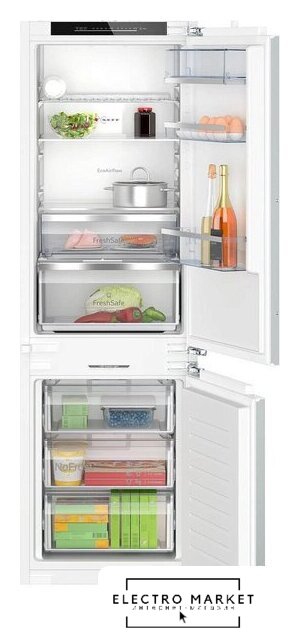 встраиваемый, жесткое, полный No Frost, электронное управление, класс A+, полезный объём: 341 л (257 + 84 л), зона свежести, перенавешиваемые двери, лоток для яиц, 69x55x193.7 см, белый