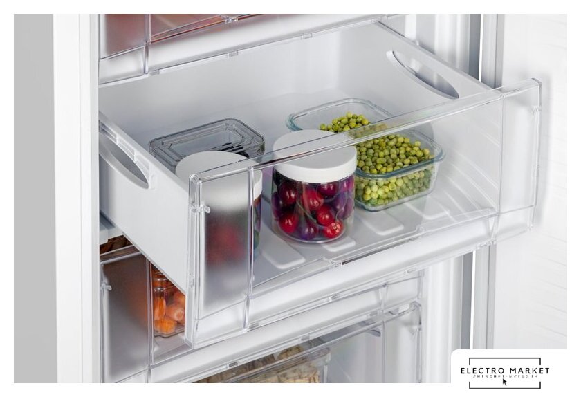 отдельностоящий, полный No Frost, электронное управление, класс A+, полезный объём: 225 л (161 + 64 л), перенавешиваемые двери, лоток для яиц, 48.5x60x174.5 см, нержавеющая сталь