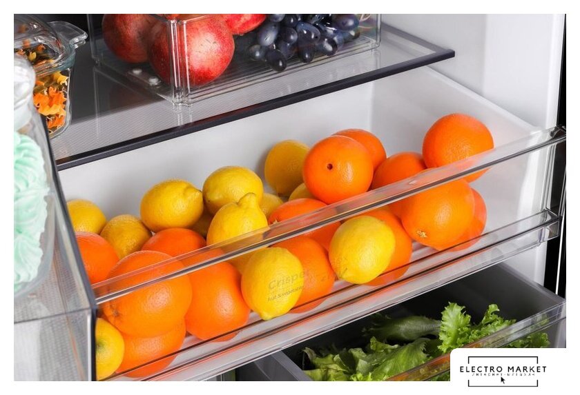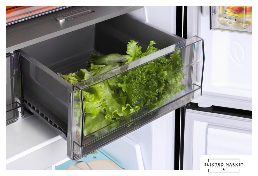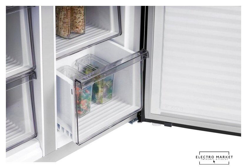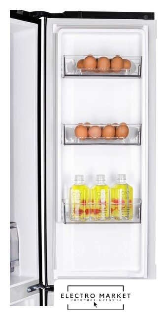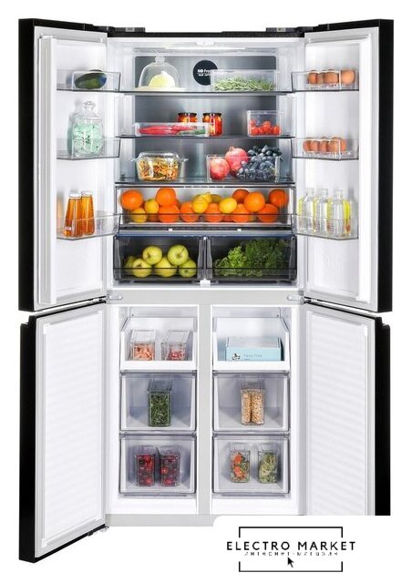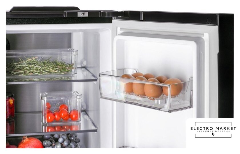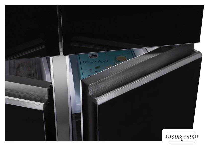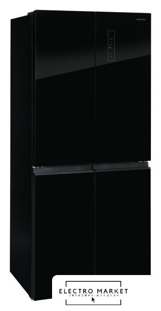 отдельностоящий, полный No Frost, электронное управление, класс A+, полезный объём: 510 л (335 + 175 л), полка для вина, лоток для яиц, отделка: стекло, 89.5x69x178.8 см, черный