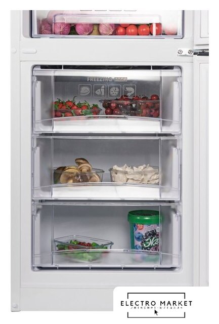 отдельностоящий, полный No Frost, механическое управление, класс A, полезный объём: 298 л (223 + 75 л), перенавешиваемые двери, лоток для яиц, 60x64x185 см, белый