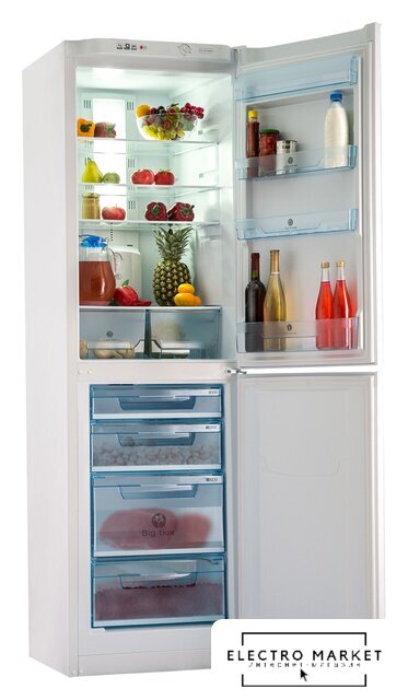 отдельностоящий, без No Frost, электронное управление, класс A+, полезный объём: 347 л (228 + 119 л), зона свежести, перенавешиваемые двери, выдвижной/подвесной контейнер, лоток для яиц, 59.5x62.7x196.8 см, белый