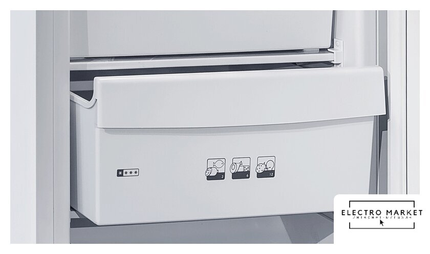 отдельностоящий, без No Frost, электронное управление, класс A+, полезный объём: 267 л (148 + 119 л), перенавешиваемые двери, лоток для яиц, 59.5x62.9x162 см, белый