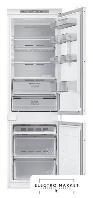 встраиваемый, скользящие направляющие, No Frost (морозильная камера), электронное управление, полезный объём: 269 л (208 + 61 л), перенавешиваемые двери, складная полка, лоток для яиц, 54x54.9x189.5 см, белый