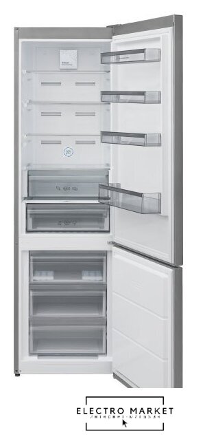 отдельностоящий, полный No Frost, электронное управление, класс A, полезный объём: 366 л, инверторный компрессор, перенавешиваемые двери, нулевой зазор, выдвижная полка, лоток для яиц, 60x66x203 см, нержавеющая сталь