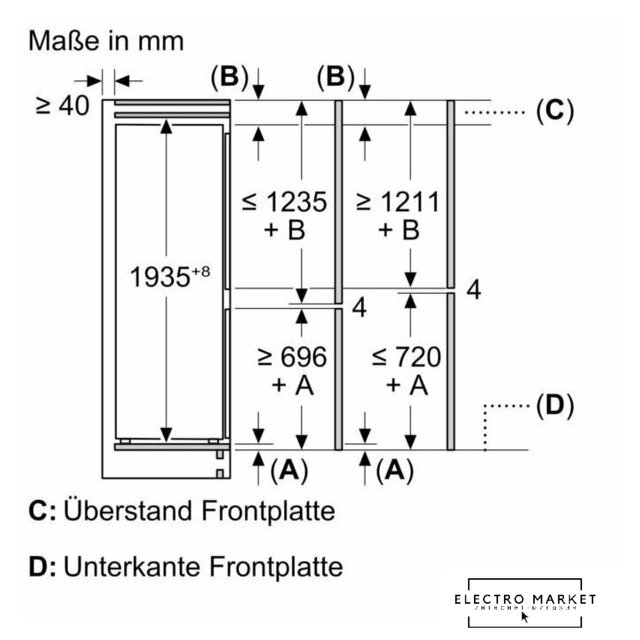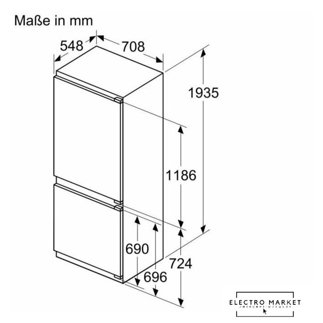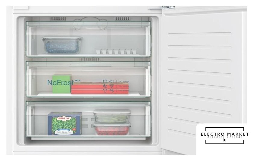 встраиваемый, жесткое, полный No Frost, электронное управление, класс A+, полезный объём: 341 л (257 + 84 л), зона свежести, перенавешиваемые двери, лоток для яиц, 69x55x193.7 см, белый