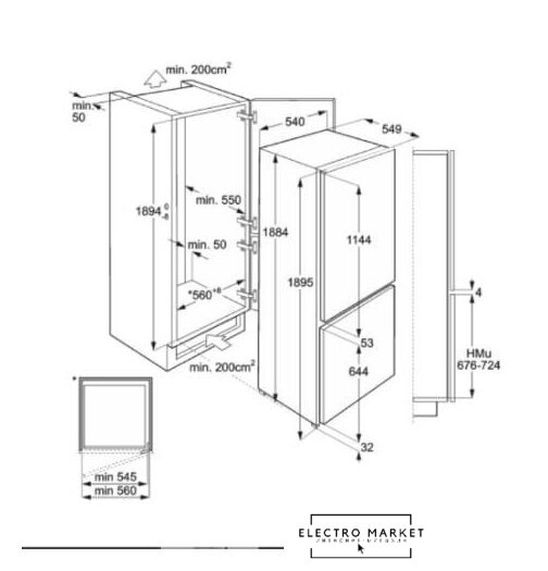 встраиваемый, скользящие направляющие, полный No Frost, электронное управление, полезный объём: 267 л (193 + 74 л), инверторный компрессор, зона свежести, перенавешиваемые двери, полка для вина, лоток для яиц, 54x55x177.5 см, белый