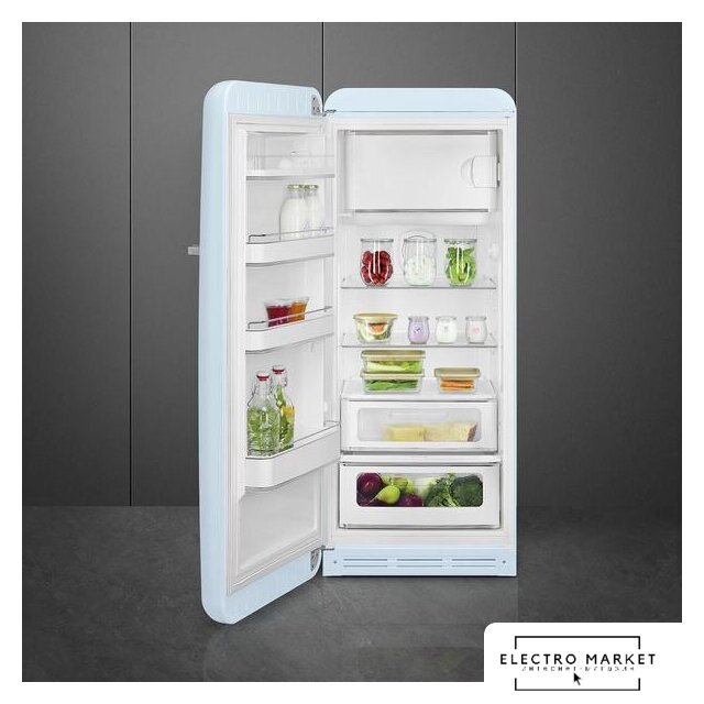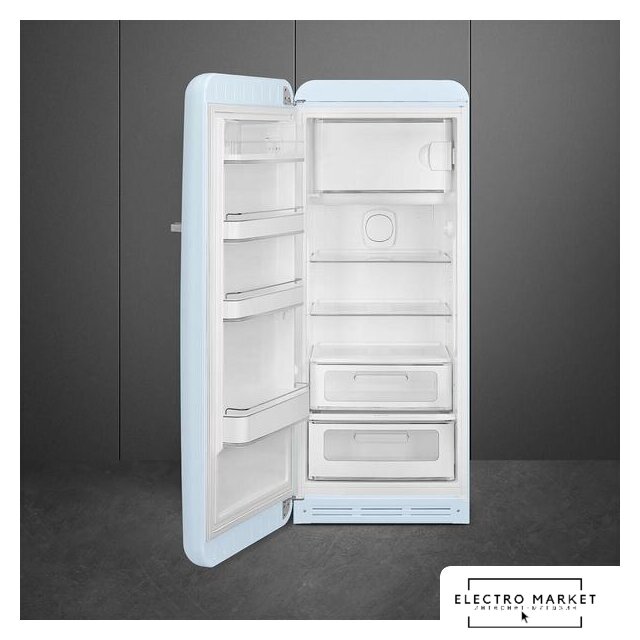 отдельностоящий, без No Frost, механическое управление, класс A+++, полезный объём: 270 л (244 + 26 л), зона свежести, лоток для яиц, отделка: ретродизайн, 60.1x78.8x153 см, голубой
