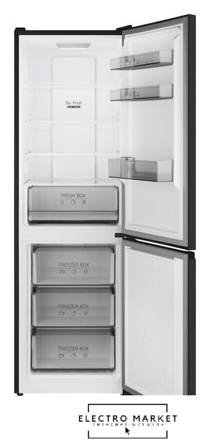 отдельностоящий, полный No Frost, электронное управление, класс A+, полезный объём: 367 л (267 + 100 л), перенавешиваемые двери, складная полка, лоток для яиц, 59.5x65x201 см, белый