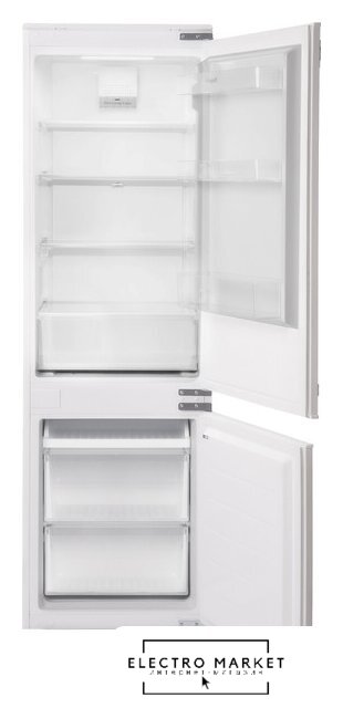 встраиваемый, жесткое, без No Frost, сенсорное управление, полезный объём: 264 л (183 + 81 л), перенавешиваемые двери, лоток для яиц, 55.9x54.6x177 см, белый