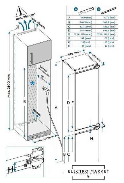 встраиваемый, скользящие направляющие, No Frost (морозильная камера), электронное управление, класс A+, полезный объём: 212 л, перенавешиваемые двери, 54x54.5x178.5 см, белый