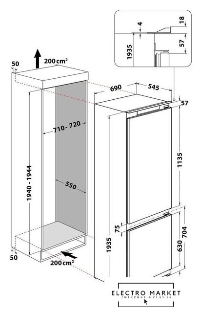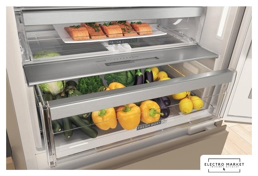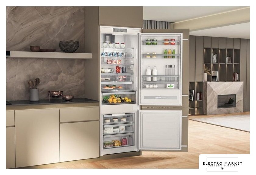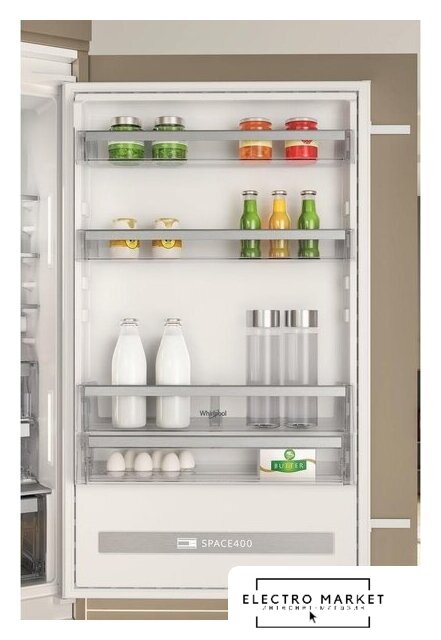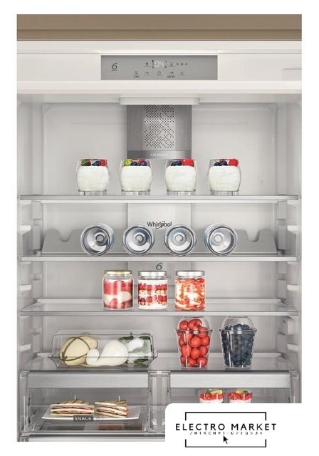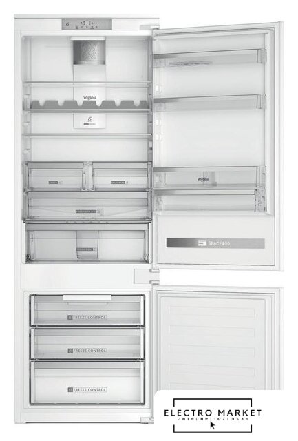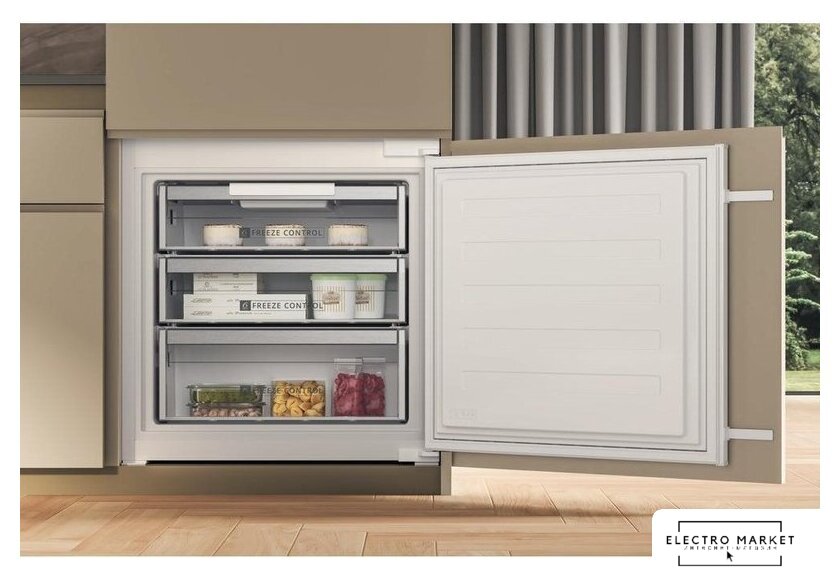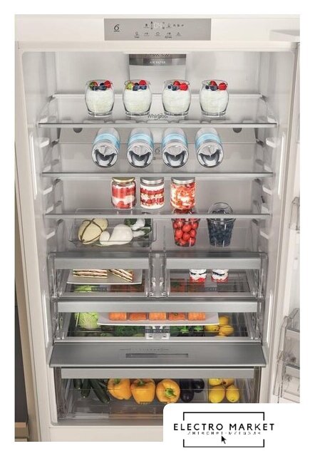 встраиваемый, плоские шарниры, полный No Frost, электронное управление, класс A+, полезный объём: 255 л (188 + 67 л), перенавешиваемые двери, лоток для яиц, 54.1x54.5x177.2 см, белый
