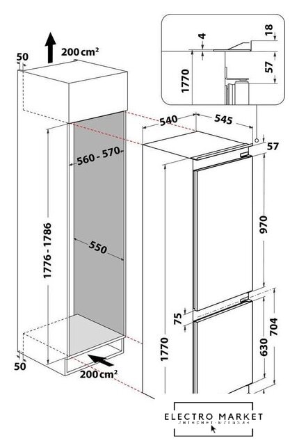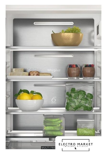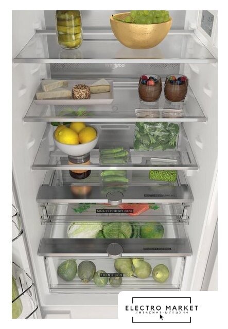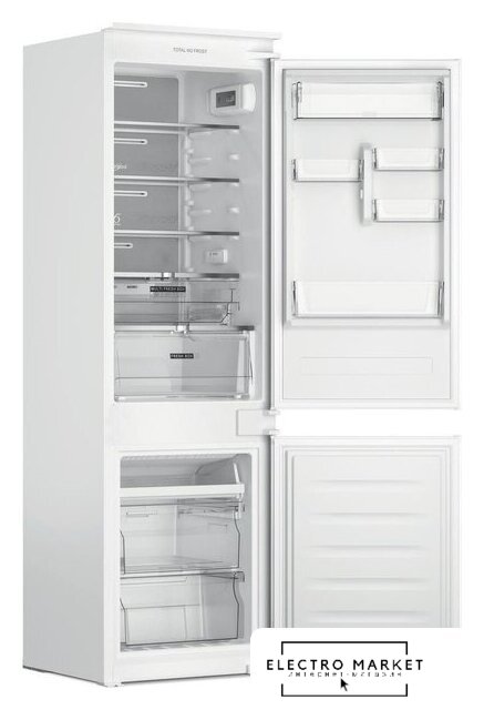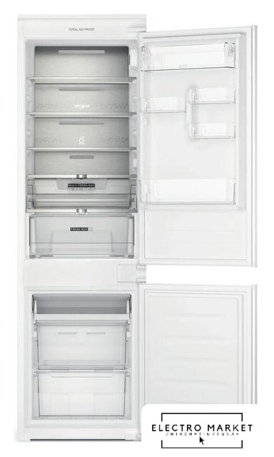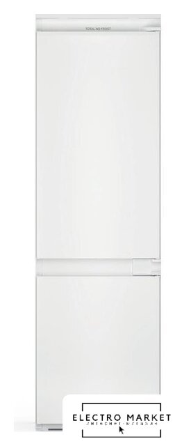 встраиваемый, полный No Frost, электронное управление, класс A++, полезный объём: 254 л (185 + 69 л), инверторный компрессор, зона свежести, перенавешиваемые двери, полка для вина, лоток для яиц, 54x54.5x177.5 см, белый
