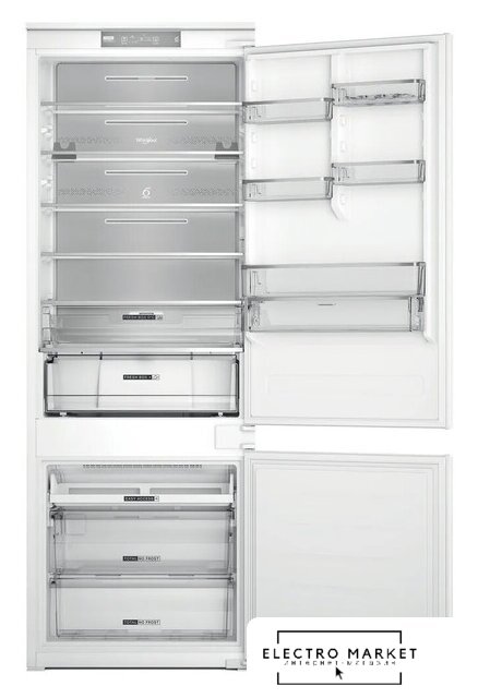 встраиваемый, No Frost (морозильная камера), электронное управление, полезный объём: 269 л (207 + 62 л), перенавешиваемые двери, складная полка, полка для вина, лоток для яиц, 54x54.9x189.5 см