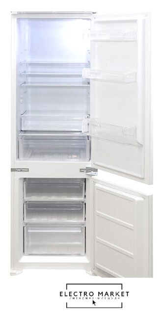 встраиваемый, No Frost (морозильная камера), механическое управление, класс A+, полезный объём: 216 л (158 + 58 л), перенавешиваемые двери, полка для вина, лоток для яиц, 54x54.5x177 см, белый