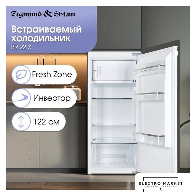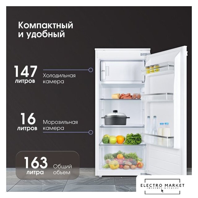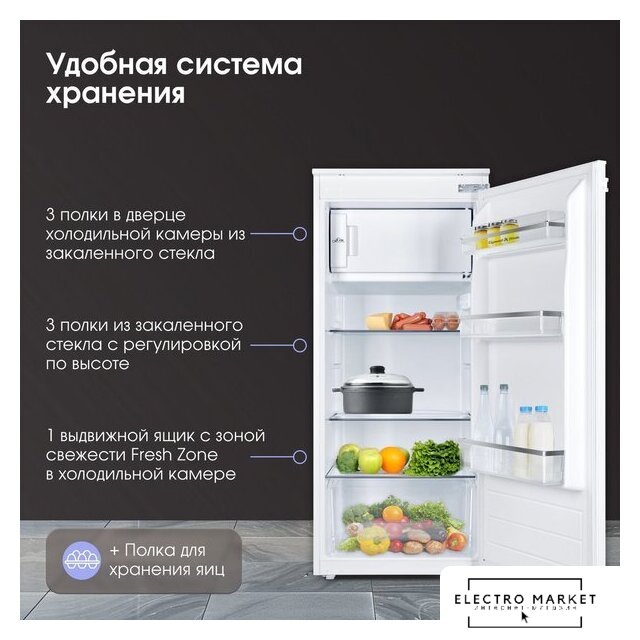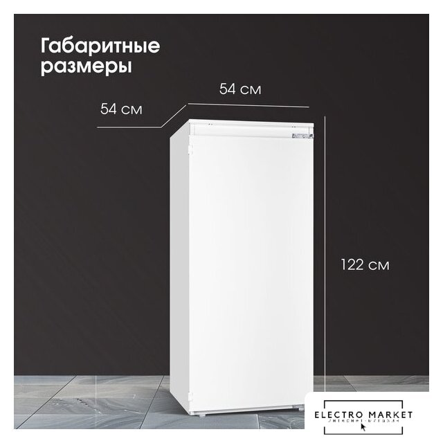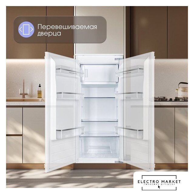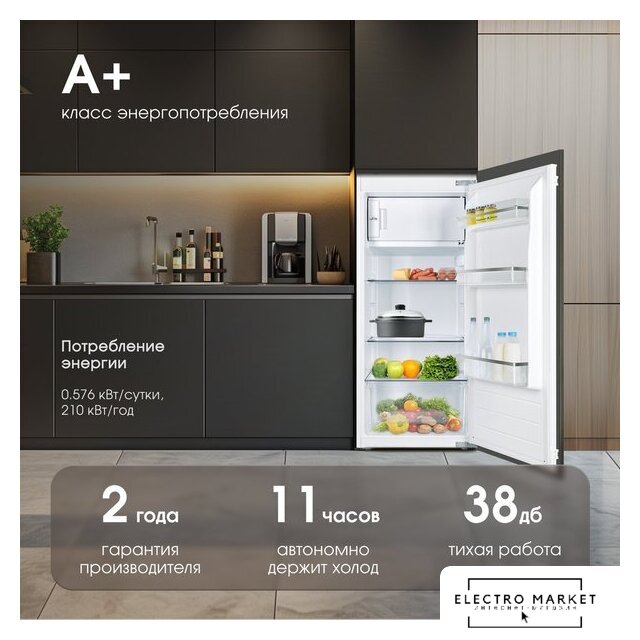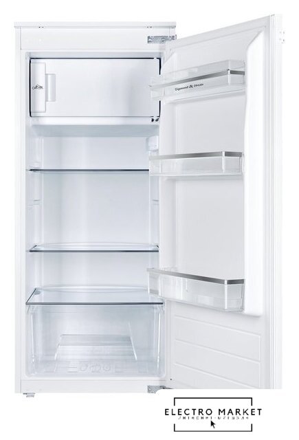 встраиваемый, без No Frost, электронное управление, класс A+, полезный объём: 121 л (104 + 17 л), перенавешиваемые двери, лоток для яиц, 59.5x54.5x81.8 см, белый