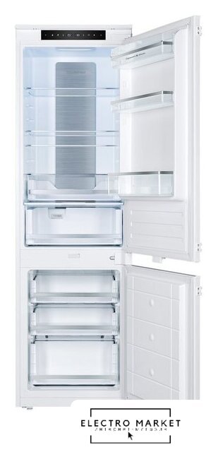 встраиваемый, скользящие направляющие, полный No Frost, электронное управление, класс A+, полезный объём: 232 л (170 + 62 л), перенавешиваемые двери, лоток для яиц, 54x54x177.2 см, белый