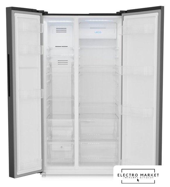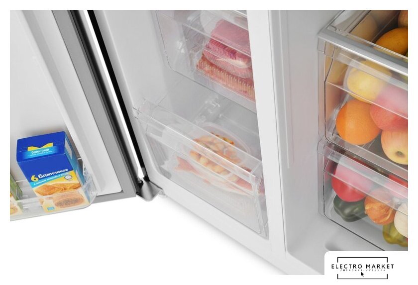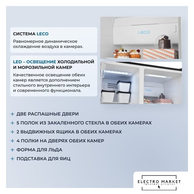 отдельностоящий, полный No Frost, электронное управление, класс A+, полезный объём: 465 л (321 + 144 л), лоток для яиц, отделка: стекло, 91.1x63.6x183 см, синий