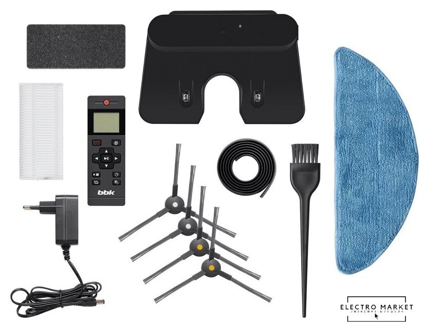 Комплектация | ПылесосЩетка для чистки фильтра Тряпка для влажной уборки - 2 штЗарядная док-станция Контейнер для водыПульт ДУАккумуляторная батареяОсновная щеткаБоковая щетка - 4 штФильтр HEPA - 2 штМагнитная лента |