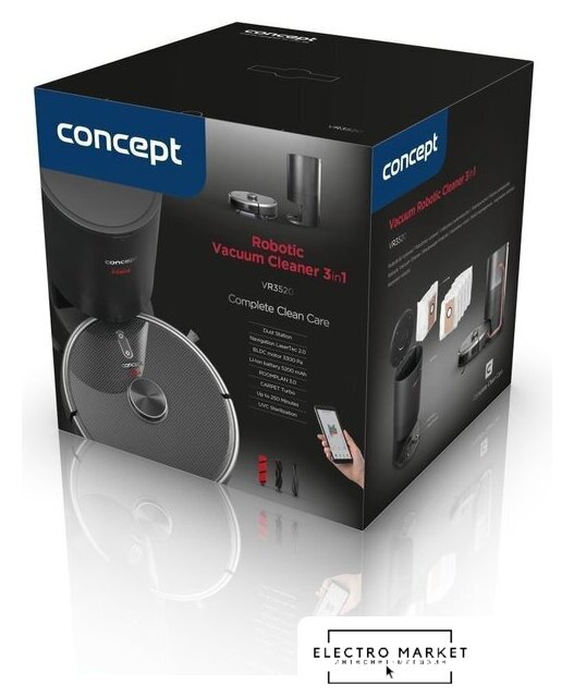 Комплектация | Зарядная станцияЩетка для ковраЩетка для полаЩетка для шерсти домашних животныхНасадка для мытья полов2x ткань для мытья полов6x мешки для мусора (SMS3500)6x боковые щетки3x HEPA-фильтр 13 + 3x поролоновый фильтрДистанционное управлениеЧистящая щетка |