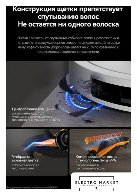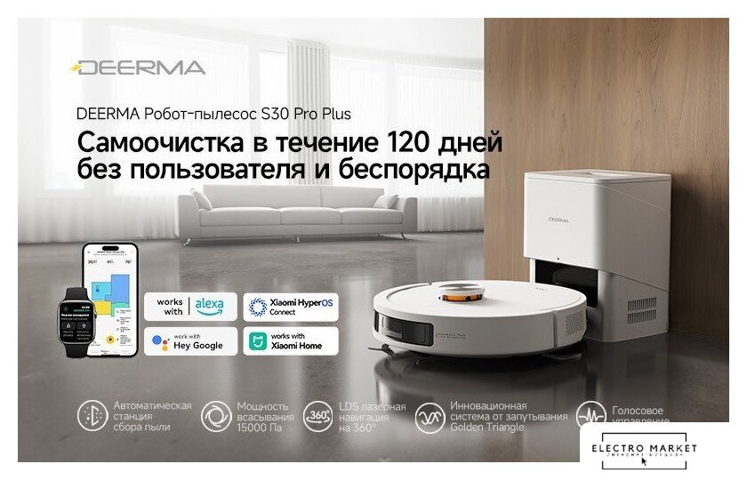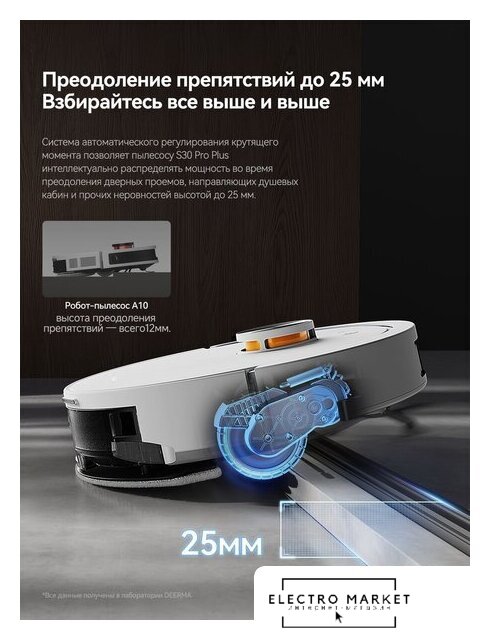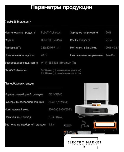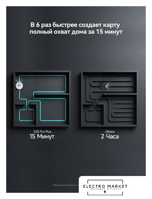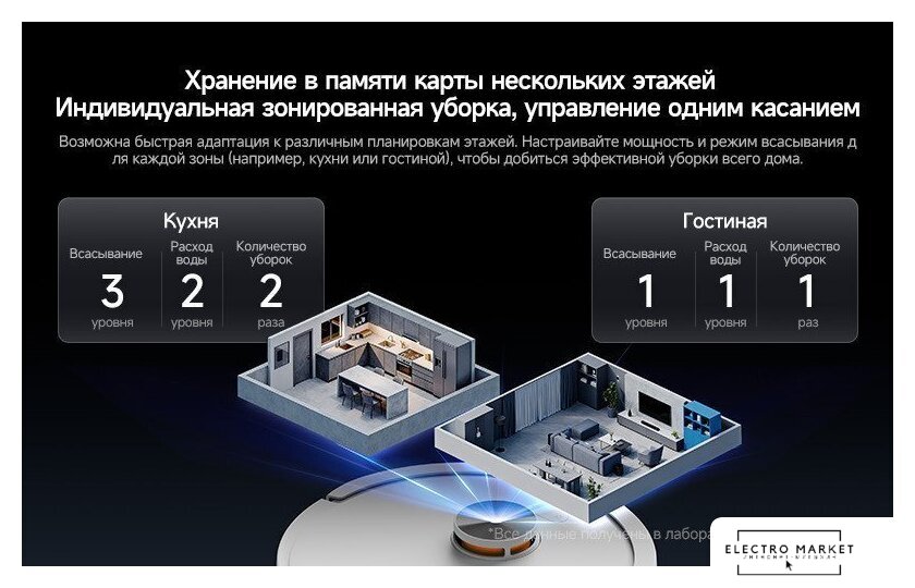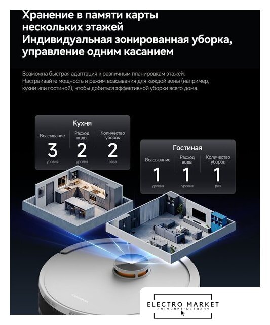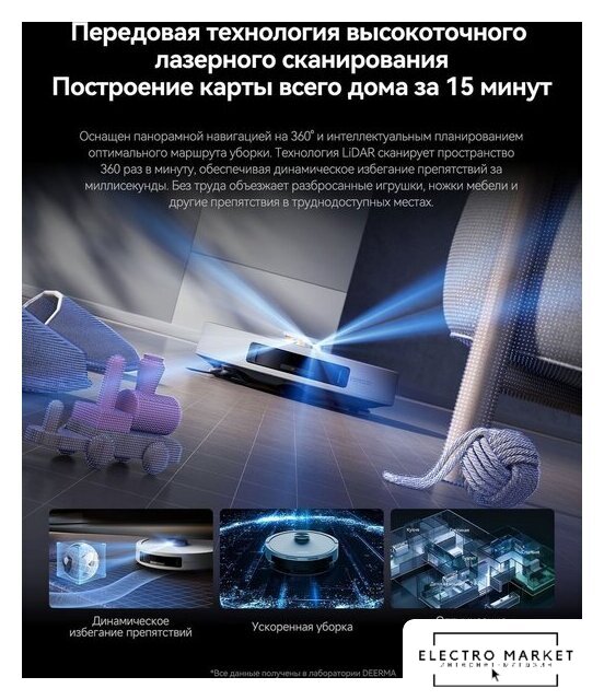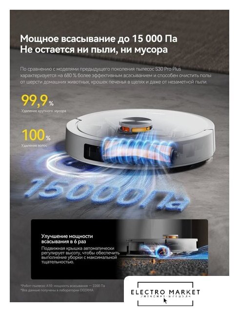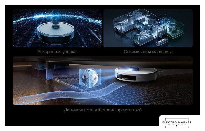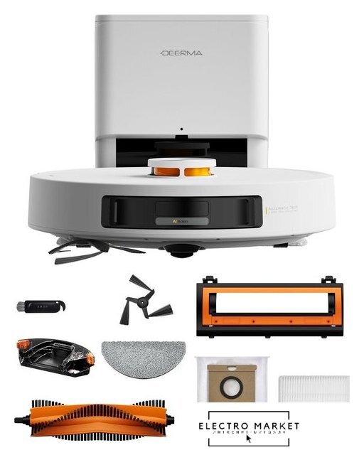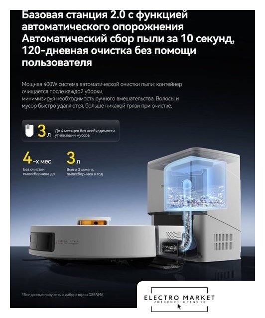 влажная уборка, фирменное приложение, мощность 75 Вт, сила всасывания 5000 Па, пылесборник 0.33 л, с турбощеткой, навигация: контактный бампер, лидар, датчики перепада высоты, лазерные датчики препятствий, план нескольких этажей, база самоочистки