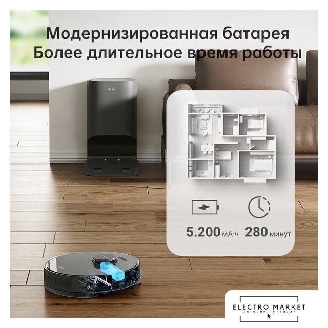 влажная уборка, Яндекс Алиса/Google Home, сила всасывания 5000 Па, пылесборник 0.5 л, с турбощеткой, навигация: контактный бампер, лидар, датчики перепада высоты, план нескольких этажей