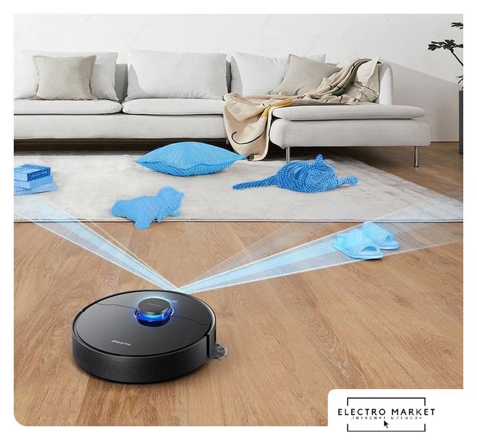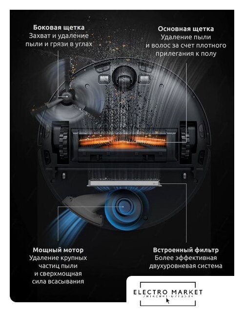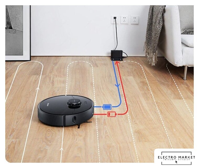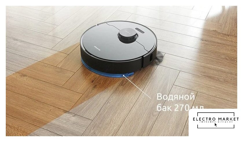 влажная уборка, сила всасывания 5000 Па, с турбощеткой, навигация: контактный бампер, лидар, датчики перепада высоты, лазерные датчики препятствий, база самоочистки