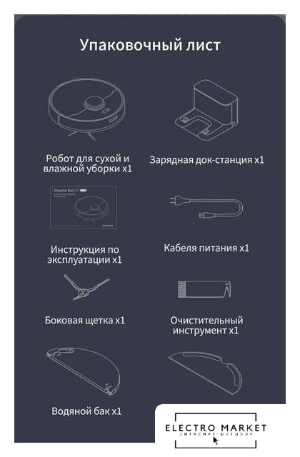 | Комплектация | Зарядная станция Приспособление для чистки Кабель питания Контейнер для воды Насадка-тряпка |