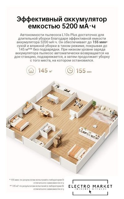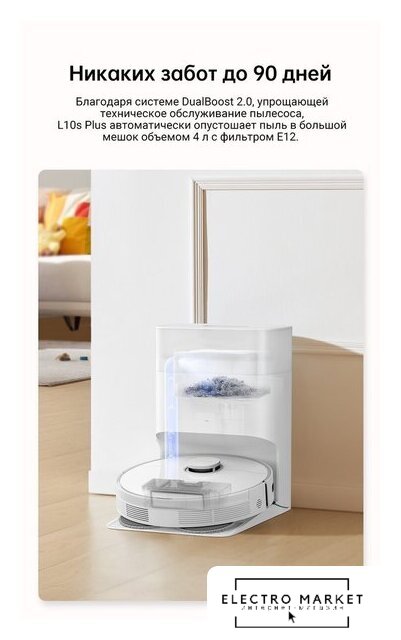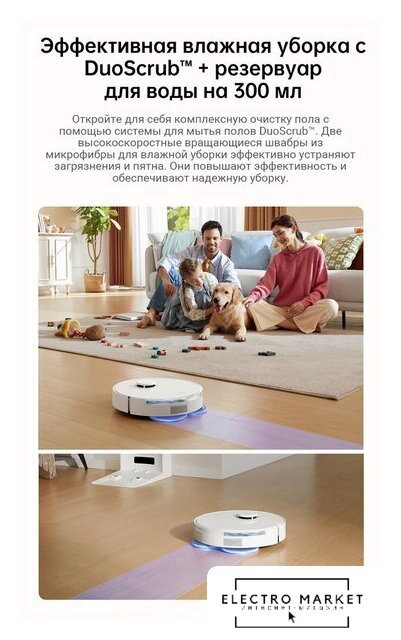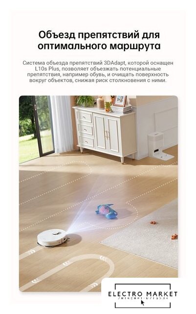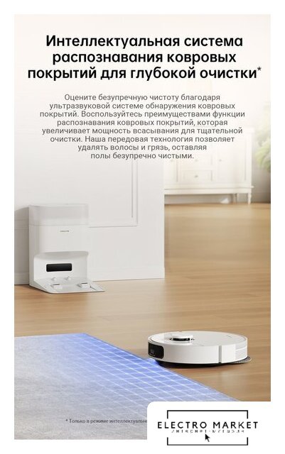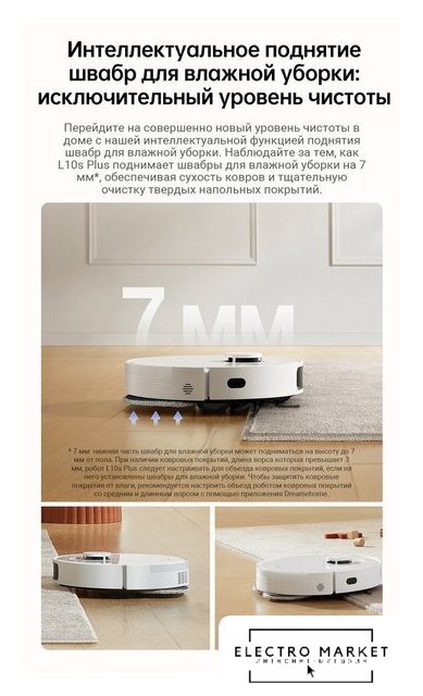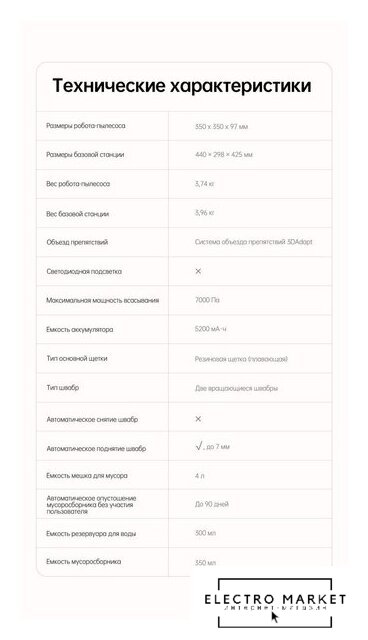 влажная уборка, сила всасывания 8000 Па, пылесборник 0.35 л, с турбощеткой, навигация: контактный бампер, лидар, камера TOF (3D), план нескольких этажей, база самоочистки