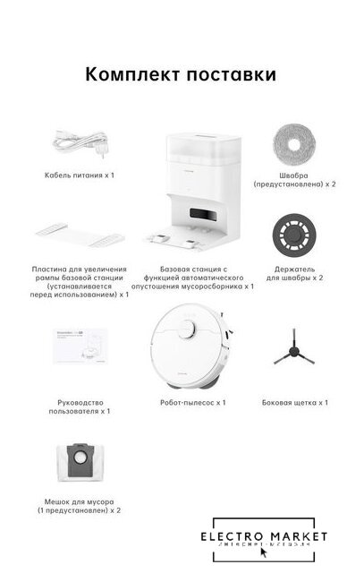 влажная уборка, мощность 46 Вт, сила всасывания 4000 Па, пылесборник 0.4 л, с турбощеткой, навигация: контактный бампер, лидар, датчики перепада высоты, база самоочистки