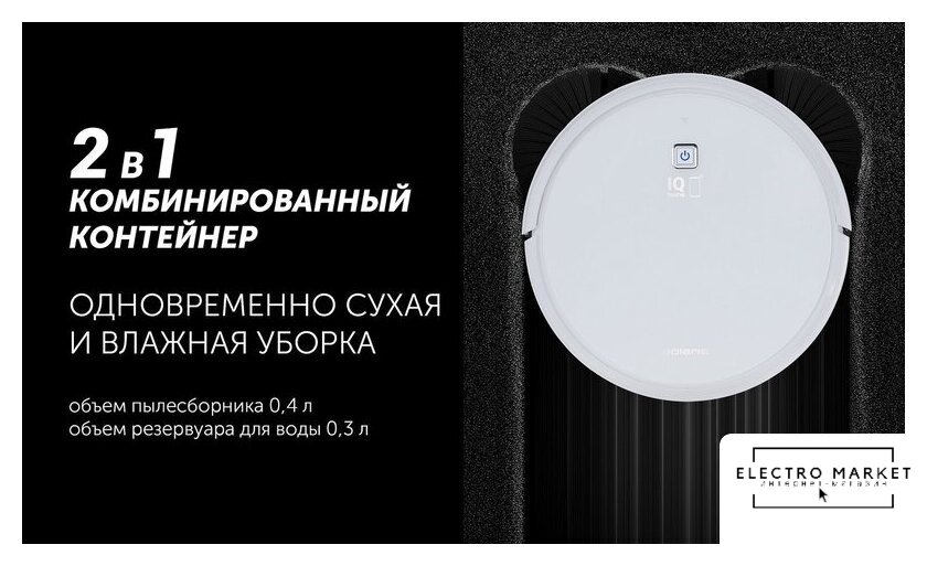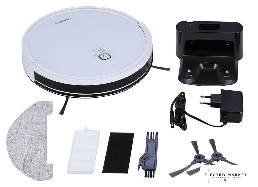 | Комплектация | 1. Робот-пылесос в сборе - 1шт.2. Пылесборник сухая и влажная уборка 2 в 1 с фильтрами (установлены) и микрофиброй - 1шт.3. АКБ (аккумуляторная батарея - установлена) - 1шт.4. База для зарядки - 1шт.5. Зарядное устройство (адаптер) - 1 шт.6. Боковые щетки (не установлены): - 2 комплекта (4 шт.)7. Запасной комплект HEPA фильтра и первичного фильтра - 1 комплект - 1шт.8. Протектор для контейнера 2 в 1 - 1шт.9. Щетка для чистки - 1 шт.10. Инструкция по эксплуатации - 1шт.11. Гарантийный талон12. Упаковка (полиэтиленовый пакет + коробка) - 1шт. |