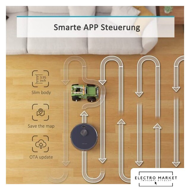 влажная уборка, фирменное приложение, мощность 40 Вт, сила всасывания 4000 Па, пылесборник 0.4 л, с турбощеткой, навигация: контактный бампер, лидар, датчики перепада высоты, база самоочистки