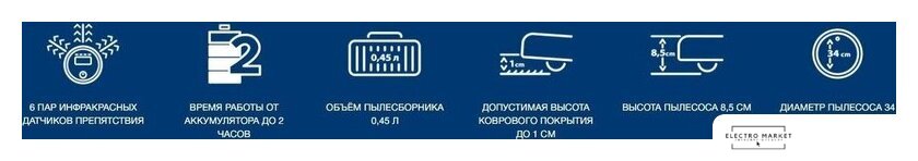 влажная уборка, фирменное приложение, мощность 35 Вт, сила всасывания 2300 Па, пылесборник 0.3 л, с турбощеткой, навигация: контактный бампер, лидар, датчики перепада высоты